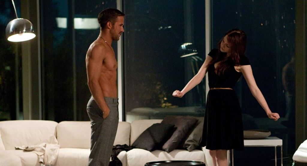 Julianne Moore (Emily) tells Steve Carrell (Cal) over dinner that she wants a divorce. Devastated, Cal sets off on his own spending a good deal of time in a bar talking to himself. That is where he meets Ryan Gosling (Jacob) a smooth womanizer who leaves with a different woman every night.