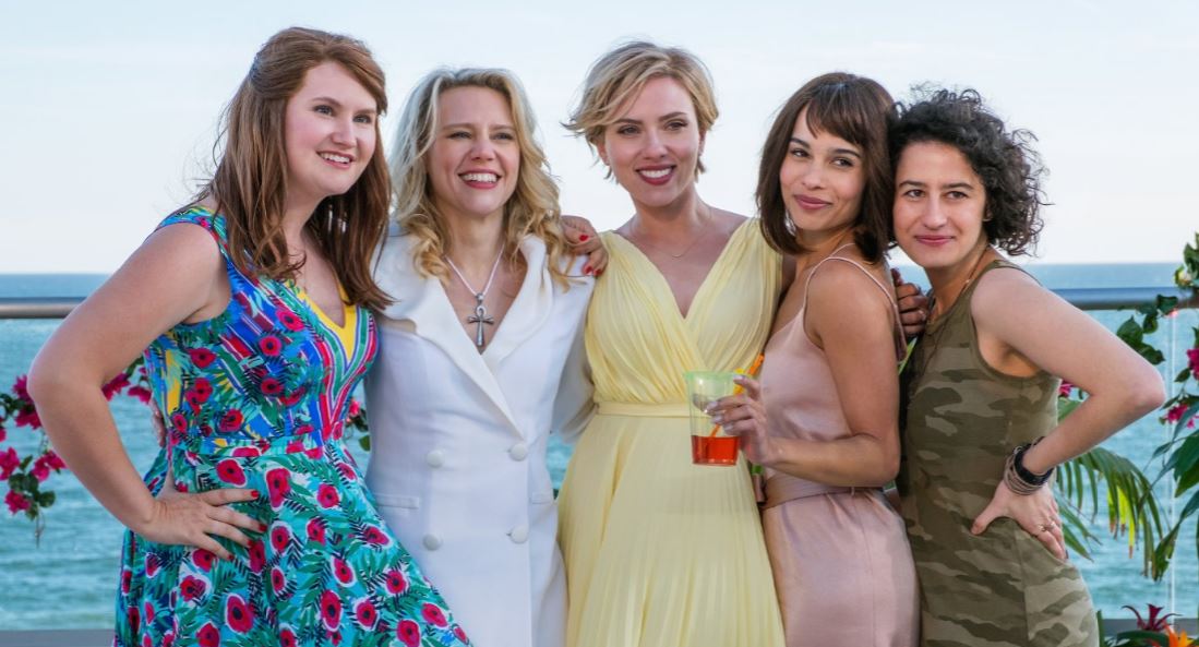 The women (Jess, Alice (Jillian Bell), Blair (Zoe Kravitz), Frankie (Ilana Glazer), and Pippa (Kate McKinnon)) head down to Miami for a weekend of debauchery (sex, booze, drugs, parties), while the guys stay home for a boring weekend of wine tasting and intellectual discussions.