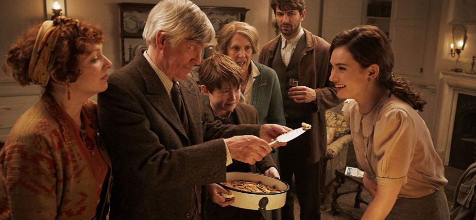 A small group of people led by Elizabeth (Jessica Brown Findley) were out late one night when the Germans confronted them about breaking curfew. Quick thinking by Elizabeth saved them from being arrested. She told the German squad leader (who she noticed was a reader) that they were on an outing of their book club. “The Guernsey Literary and Potato Peel Society” was born so they could eat the last pig on the Island not taken by the Germans.
