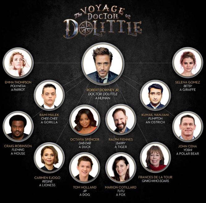 “Dolittle” is a fun, action packed, movie that is at times hilarious and heartwarming. Mainly for kids, it has a few adult one-liners that you have to concentrate to hear. The animal CGI effects are terrific and the guest stars voicing them are, for the most part, superstars. See the picture below.