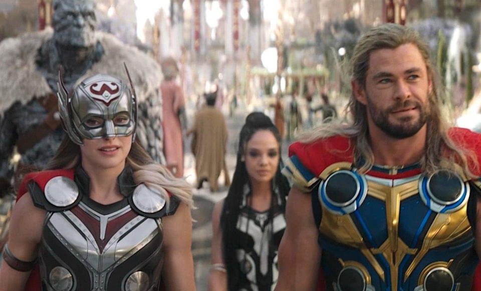 Luckily, Thor calls up his team of superheros to help him fight Gorr in the Dark Realm and, hopefully, save the kids of Asgaard: Jane (who left her hospital bed, travelled to New Asgaard, picked up Mjolnir, and is now the Mighty Thor), Korg (Taika Waititi), and King Valkyrie (Tessa Thompson).